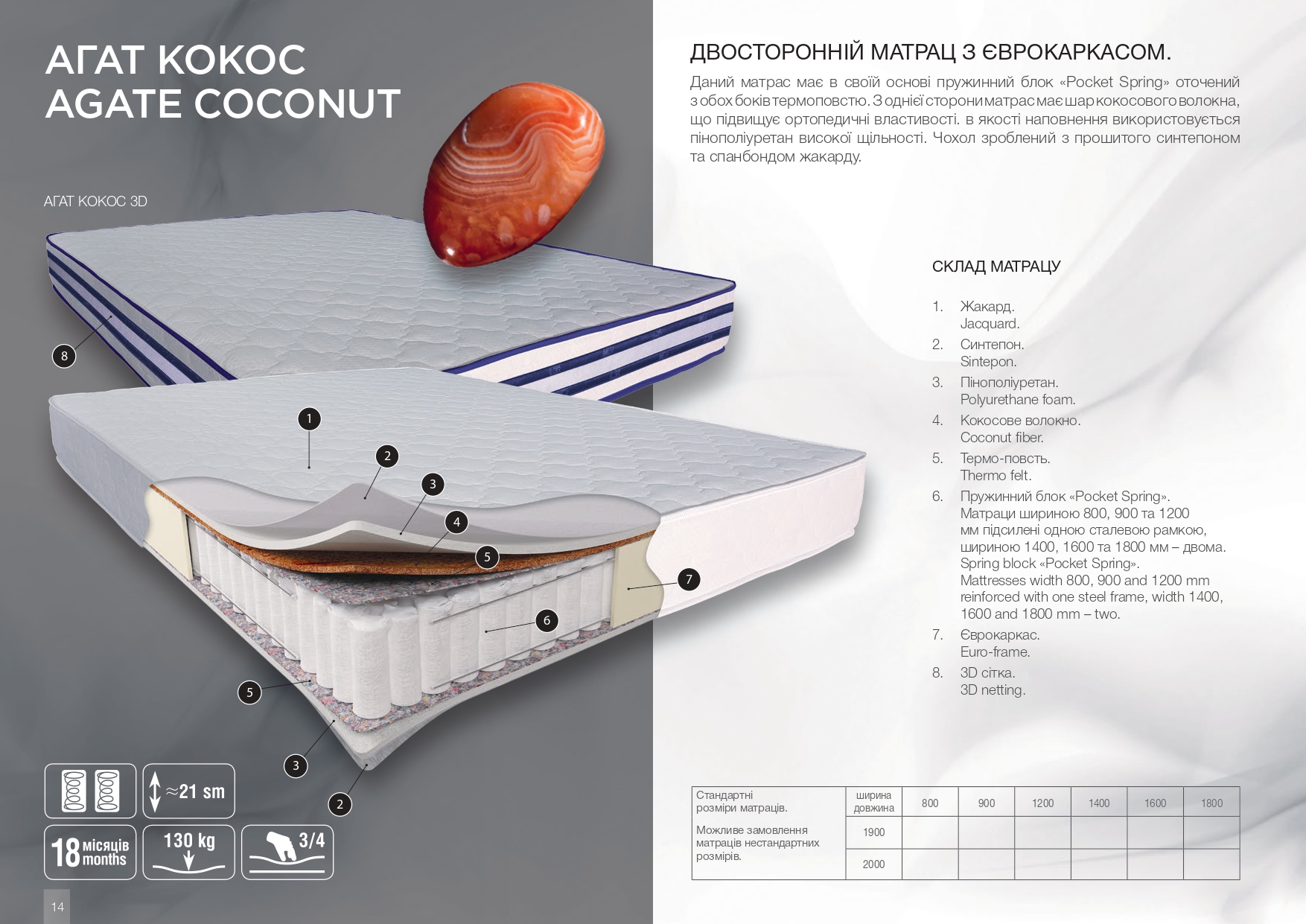 Ортопедический матрас Агат Кокос 3D на основе независимого пружинного блока "Pocket Spring". Высота 21 см, нагрузка на одно спальное место до 130 кг. Разная спепень жесткости: с одной стороны умеренно-жесткая, с другой стороны - жесткая. Независимый пружинный блок Pocket Spring состоит из пружин разной жесткости, каждая из которых зашита в отдельный плотный чехол. Такое ортопедическое и энергономическое решение позволяет каждой пружине отдельно, друг от друга, сжиматься под весом тела и максимально адаптироваться к форме тела. Как правило, на 1м2 расположено 220-260 пружин.